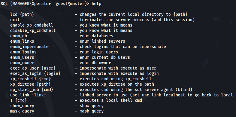 impacket-mssqlclient -p 1433 manager/operator:operator@manager.htb -windows-auth